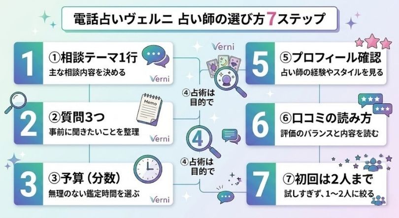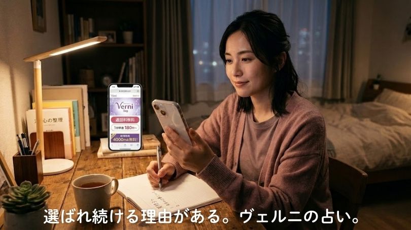 電話占いヴェルニは、占い師のプロフィールや占術・相談ジャンルで絞り込みやすく、「まず相談してみる」までの距離が短いサービスです。