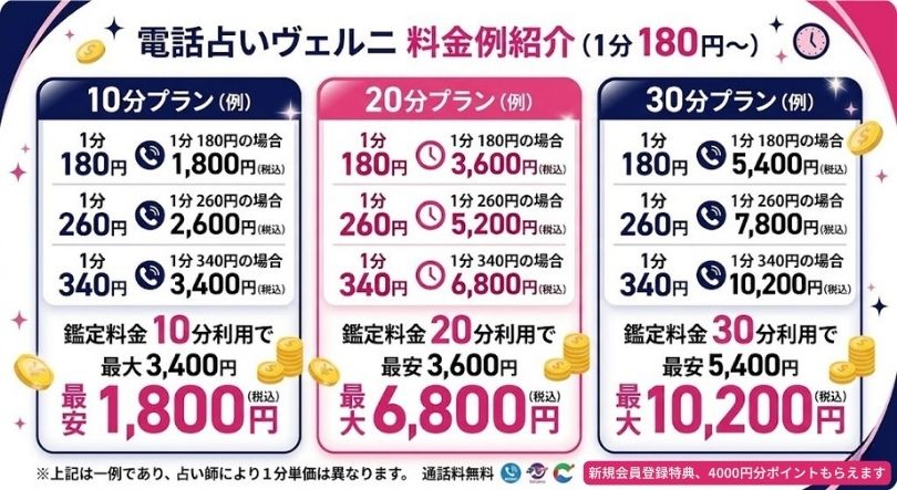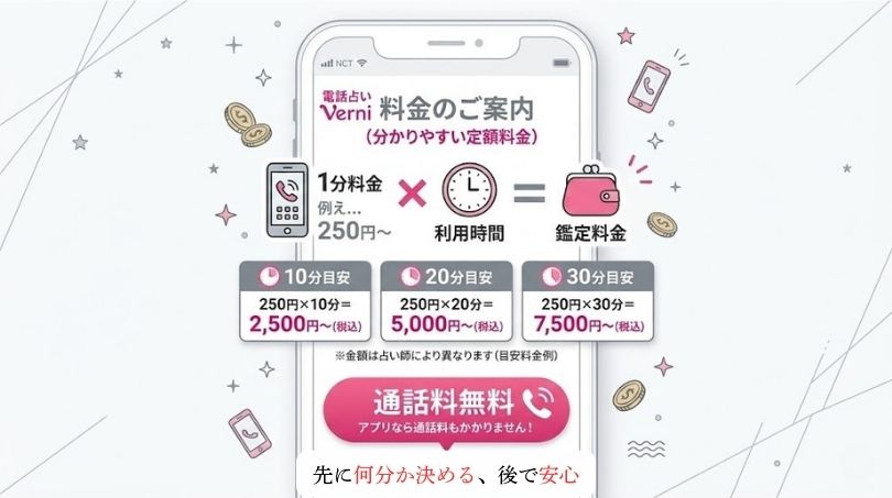 電話鑑定料金は 「1分あたりの鑑定料金×利用時間」 となっています。 (vernis.co.jp)