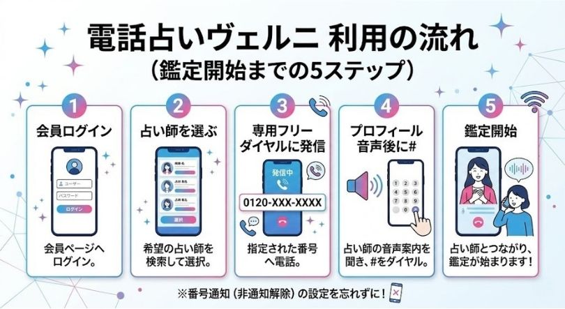 電話鑑定の流れは、公式の案内ページで図解されています。