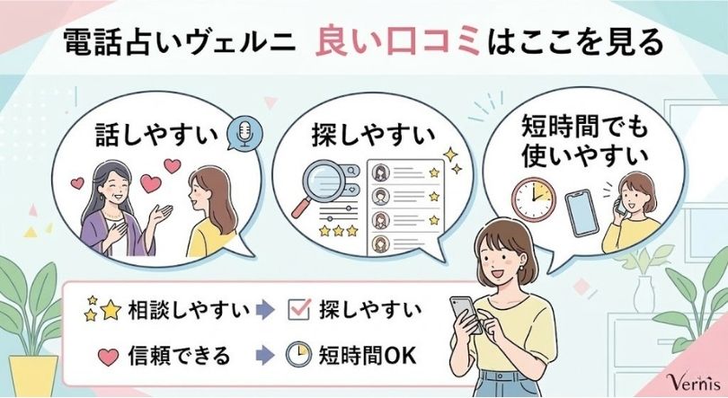 この記事では、電話占いヴェルニの口コミや評判をどう見ればよいか、良い声と気になる声の分け方、向いている人の特徴を順番に整理します。